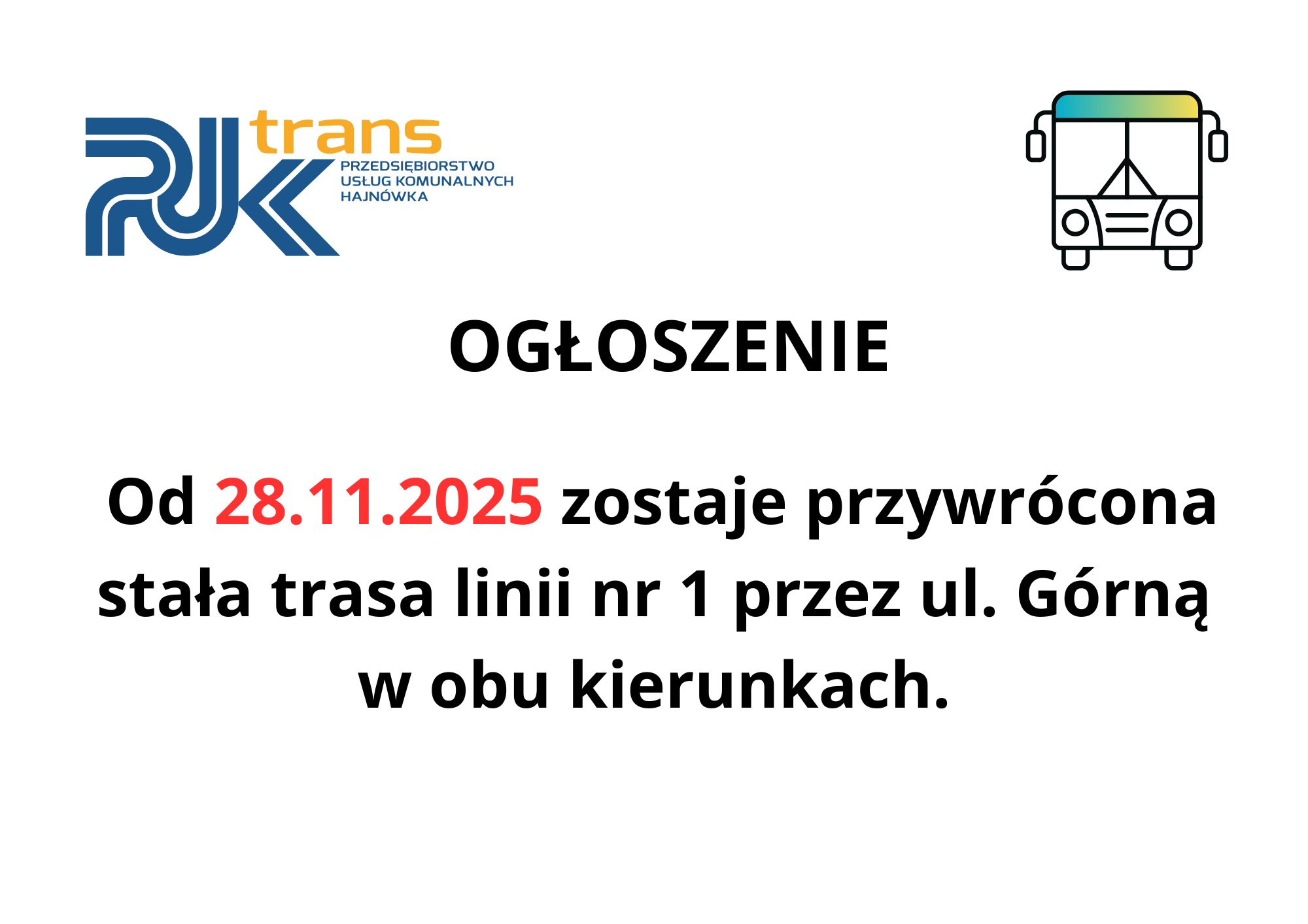Ogłoszenie: przywrócenie stałej trasy linii nr 1 przez ul. Górną — więcej