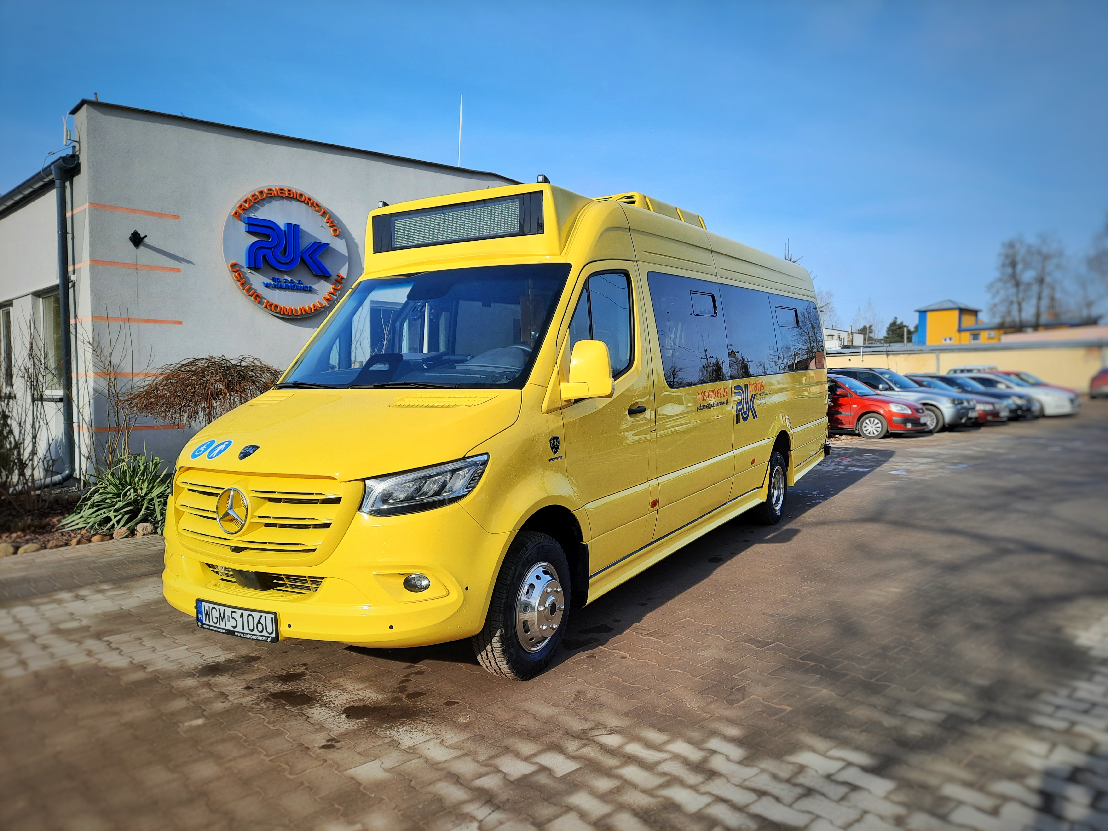 Nowy Mercedes Sprinter wyróżnia się również jasnym, słonecznym kolorem, dzięki czemu jest dobrze widoczny na ulicach Hajnówki.